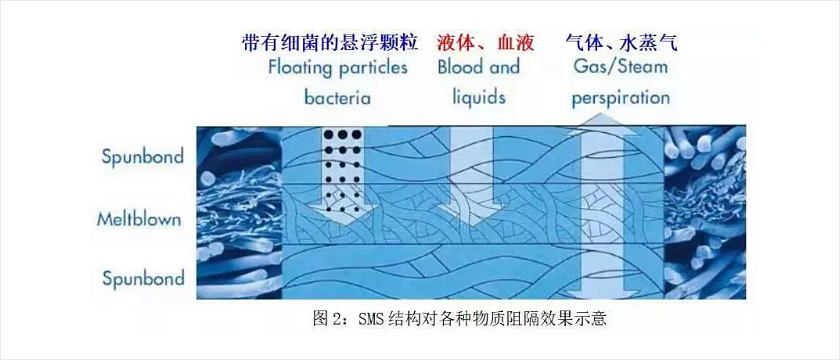 這里面的S表示紡粘層(Spunbond),其纖維直徑比較粗,在20微米(μm)左右,2層S紡粘層主要作用是支撐整個無紡布結(jié)構,對阻隔并沒有太大的作用??谡掷锩孀钪匾氖亲韪魧踊騽t熔噴層M(Meltblown),熔噴層的纖維直徑比較細,在2微米(μm)左右,所以只有紡粘層直徑的十分之一,這個對防止細菌、血液滲透起至關重要的作用。