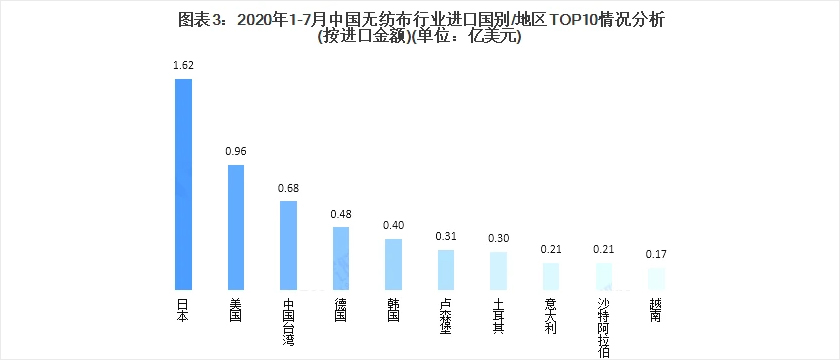 從進(jìn)口地區(qū)來看,日本是我國無紡布進(jìn)口主要來源國,2020年1-7月,我國從日本的進(jìn)口金額達(dá)到1.62億美元,占進(jìn)口金額總額比重為23.97%;其次為美國,實(shí)現(xiàn)0.96億美元的進(jìn)口金額,占比14.23%;再者是中國臺灣,實(shí)現(xiàn)0.68億美元的進(jìn)口金額,占比10.13%。