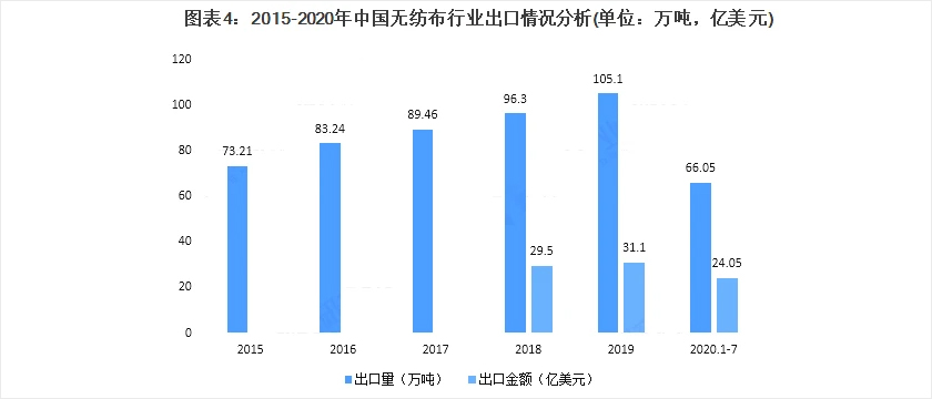 近年來,我國無紡布出口數(shù)量和出口額均呈現(xiàn)穩(wěn)定增長。2019年,中國無紡布行業(yè)出口數(shù)量為105.1萬噸,出口額達(dá)到31.1億美元。2020年1-7月,中國無紡布行業(yè)出口數(shù)量為66.05萬噸,出口額達(dá)到24.05億美元。